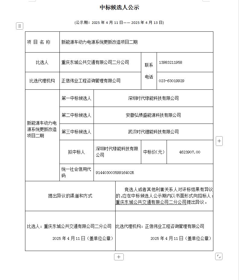 网赌信誉平台二分公司新能源车动力电源系统更新改造项目二期中标候选人公示