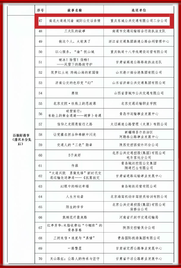 自活动启动以来,公司领导高度重视,龙盛经营部积极响应,在市交通运输委、市道路运输事务中心、渝北区交通运输委、渝北区道路运输事务中心和物流集团的关心、帮助与支持下,经组委会材料初筛、活动初选,东城公交川渝20路好故事《南北大道连川渝 城际公交话亲情》成功入选百强好故事,使东城公交在成渝双城经济圈建设中的积极作为得到了有效展示。