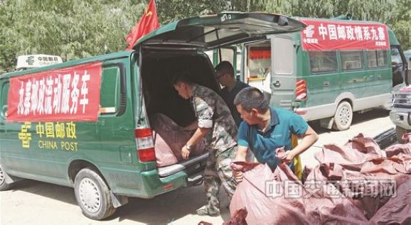 图为漳扎邮政支局工作人员为灾区群众收寄包裹。