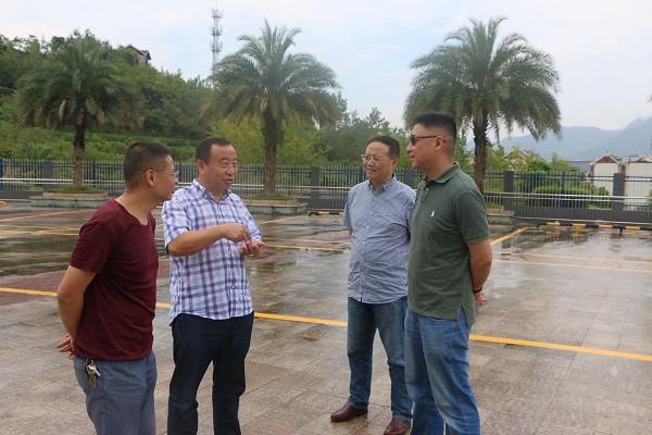 2017年8月29日,北碚区运管处处长王春、副处长张勇在东城公交董事长舒渝、副总经理张卫的陪同下,到北碚静观公交换乘枢纽站建设工地视察工作。