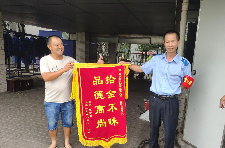 2019年8月28日,一位中年男子来到东城公交空港枢纽站,专程为咱们的公交驾驶员周天明送来了一面印有“拾金不昧品德高尚”的锦旗,表达自己的感激之情。