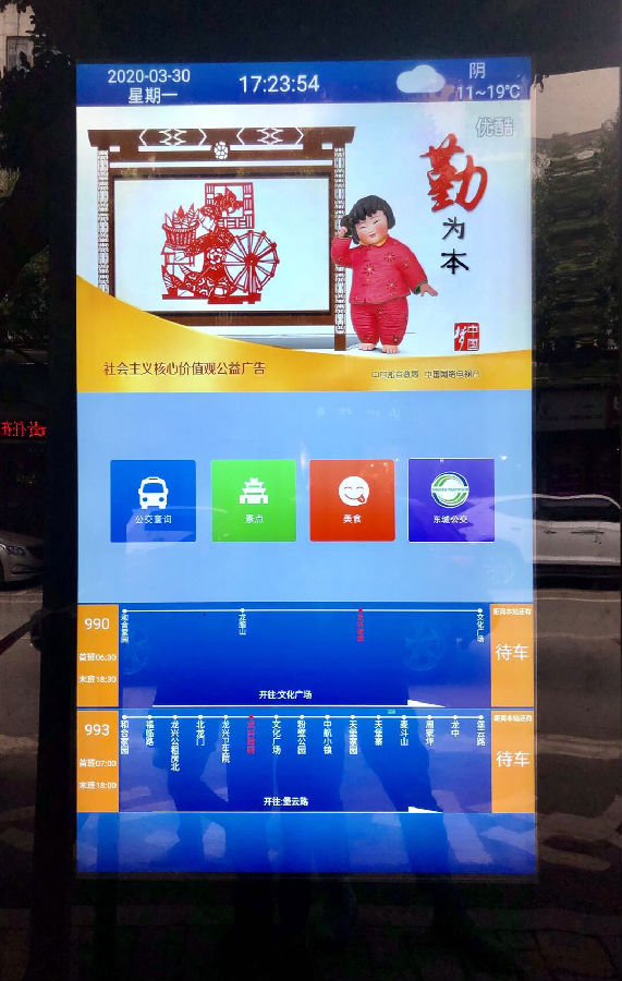 通过与公交智能调度系统连接,利用显示屏能实时查询车辆始末发班、车辆距离几站、车辆即将进站、车辆进站4种精准状态,并对即将到站的车辆进行语音播报提醒,为不同年龄阶段市民提供贴心服务。