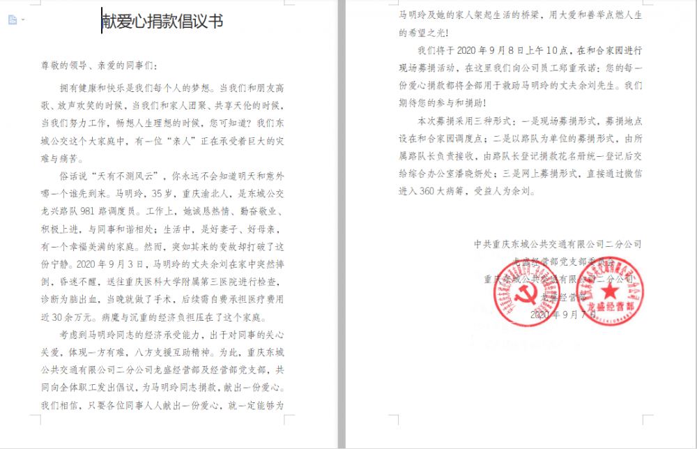 得知这一情况,龙盛经营部领导班子高度重视,向经营部全体员工发出“爱心捐款倡议书”,组织发起了爱心捐款活动,广大干部职工立即积极响应号召,踊跃捐款。“50元、100元、200元……”每一笔捐款,都代表了东城公交每一位员工的真诚爱心。截止至9月16日,共计187人参与捐款活动,收到爱心捐款25374元。