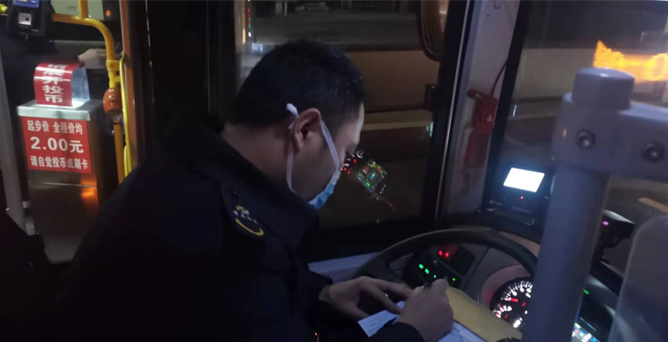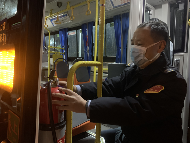 (包旭东师傅正在对第一班车进行出车前的车辆检查)