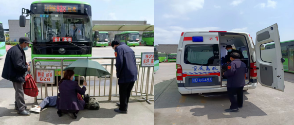 上午11点4分,928线一名老人在国际生物城站候车时突然晕厥,站务人员唐志菊和任龙海看到后第一时间进行处置,及时拨打了120急救电话。特别是调度员唐志菊一直半蹲着为晕厥的乘客撑着伞,避免阳光的暴晒,让该乘客保持侧体位,并时刻呼唤着她,使其意识保持清醒,直到120救护车的到来。