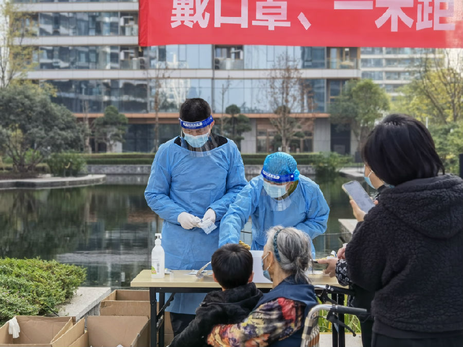 东城公交党员任然协助核酸检测医护人员发放抗疫试剂。党员张黎配合社区进行物资配送,劝返出行人员。