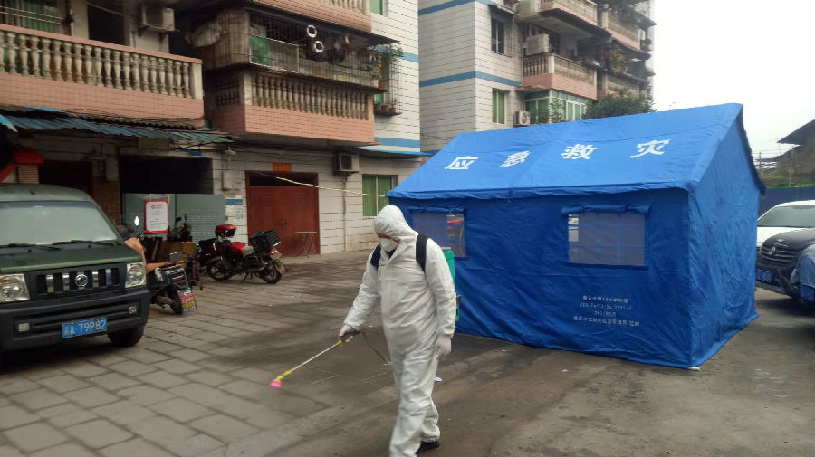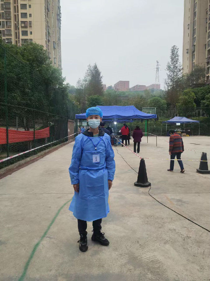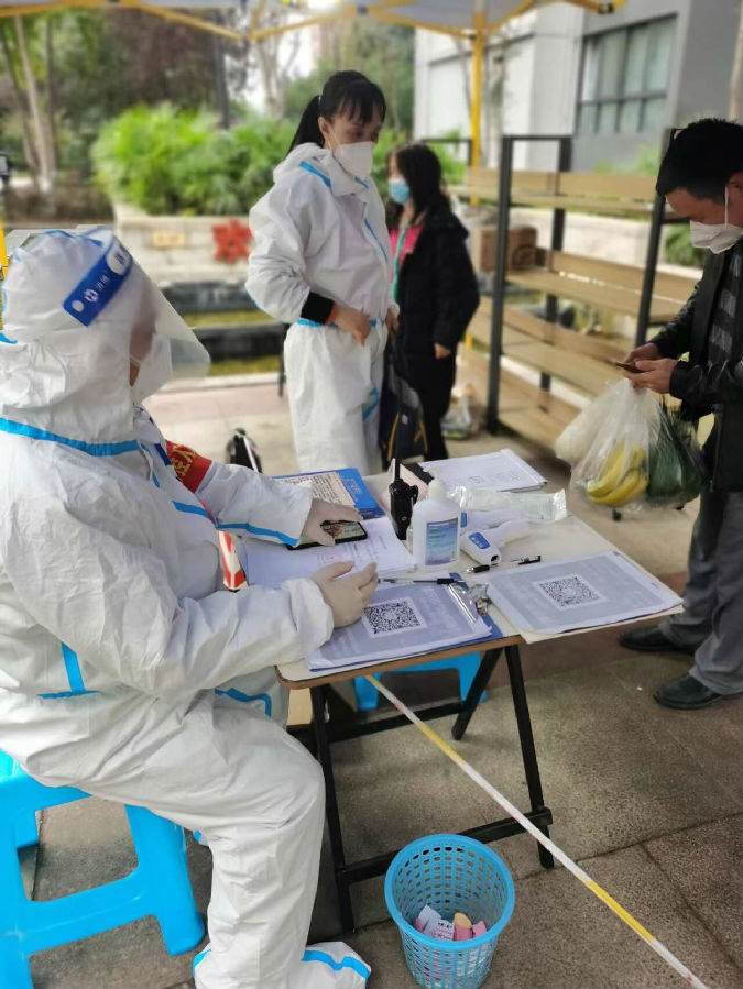 东城公交党员何昌建负责提醒群众检测核酸,并帮助居民搬运生活物资。党员余春艳负责楼栋消毒。